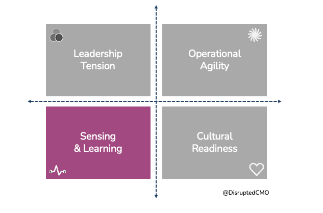 In the Disruption-Fluent Marketing framework, Sensing & Learning is defined as "the capacity to detect emerging changes in the environment from all sources and systematically convert experience into organizational knowledge." It comprises four interconnected components:
