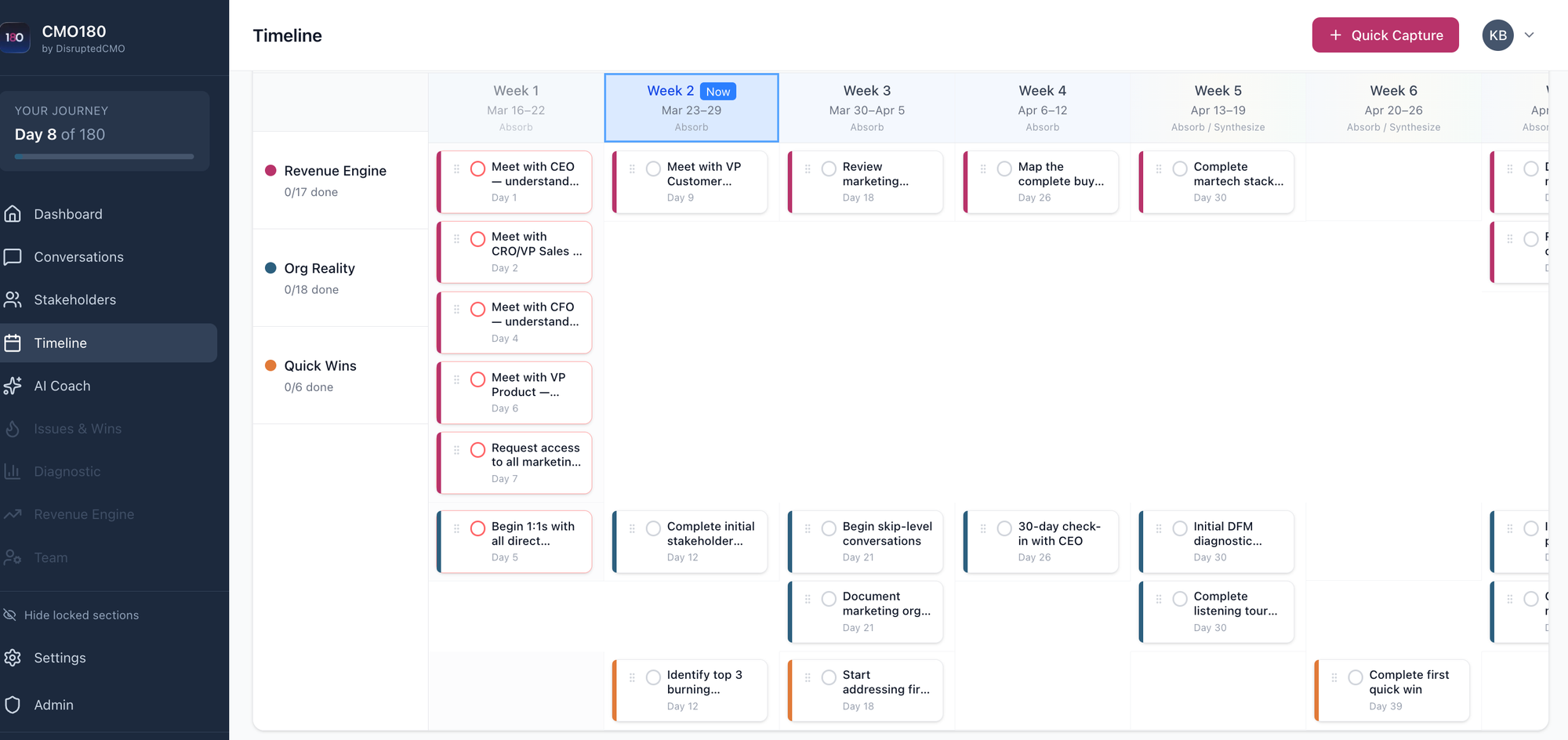 Revenue Engine, Organizational Reality, and Quick Wins run as parallel workstreams, mirroring how the job actually hits you. The AI helps you make sense of it all, look for trends, and identify potential Quick Wins along the way.