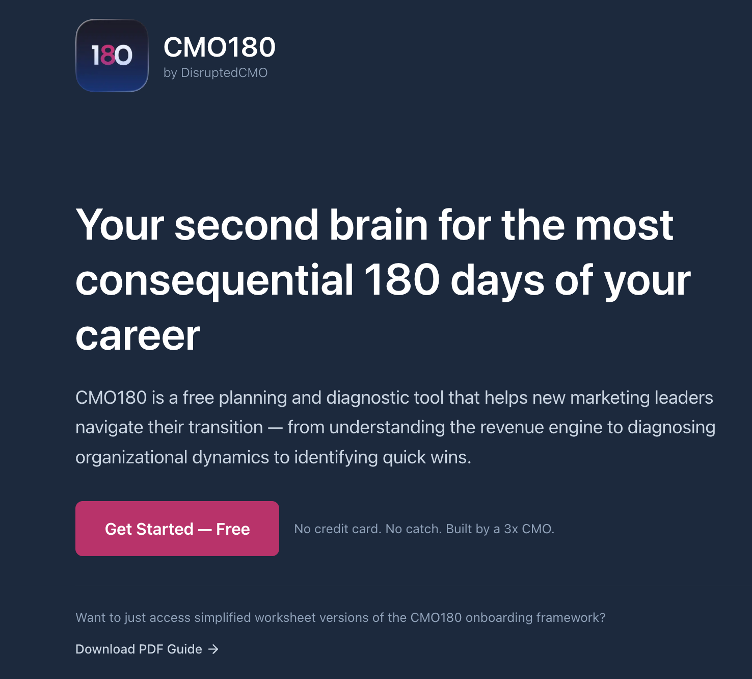 To push and refine my own thinking and put this model into practical use, I built a tool to help any CMO/executive marketing leader facing a new role or major transition navigate those critical first couple of quarters: CMO180.