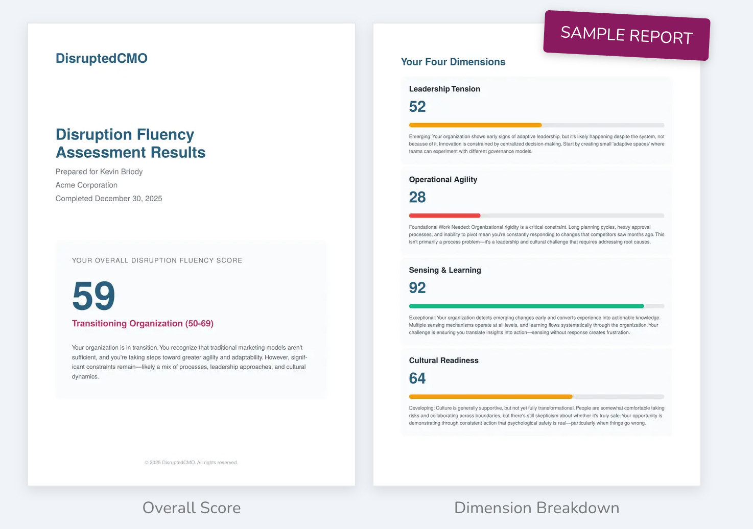 How disruption-fluent is your team? This is an interactive self-assessment designed for CMO's and other marketing leaders to get a high-level view into how their organization scores against each of the four dimensions of the Disruption-Fluent Marketing Framework. 5-10 minutes, 20 questions, and marketing leaders will receive their results in a detailed PDF report along with follow-up resources to help them explore how to address their weakest dimension.