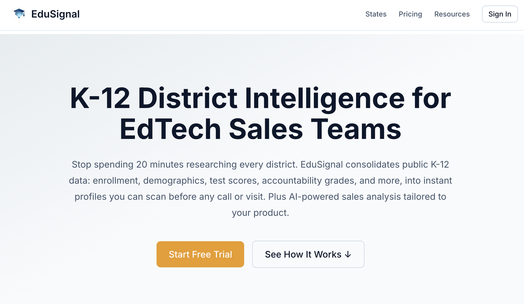 A full-stack startup build using Claude Code as the core engine. EduSignal aggregates state (DOEs) and federal (NCES) public datasets on K-12 school districts, layers it with AI-driven context-sensitive sales strategy analysis, and renders it all in a simple, visual, and easy to understand interface for EdTech sales reps. It's intended as a pre-sales conversational intelligence tool, so reps, especially those in small/mid-market EdTech vendors who don't have the benefit of deep CRM data enrichment or research teams, can walk into their next call or visit with confidence.
